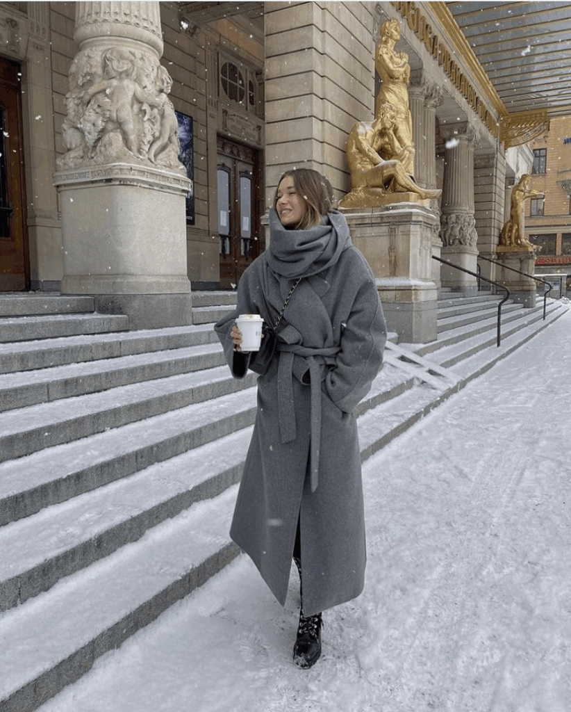 - Пальто-халат: універсальна модель із запахом та поясом, яка підходить практично всім типам фігури, дозволяючи акцентувати талію та регулювати об’єм виробу;