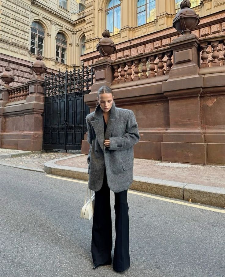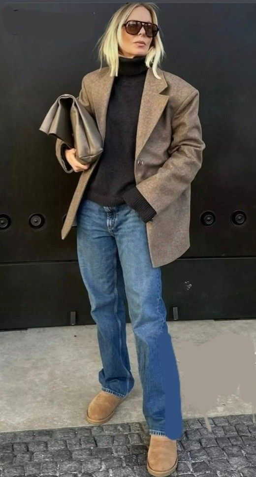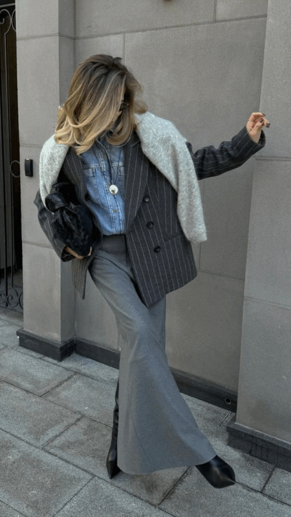 - Джинси прямого крою або палаццо: щільний денім чудово дружить з вовною та твідом, створюючи універсальний міський образ;