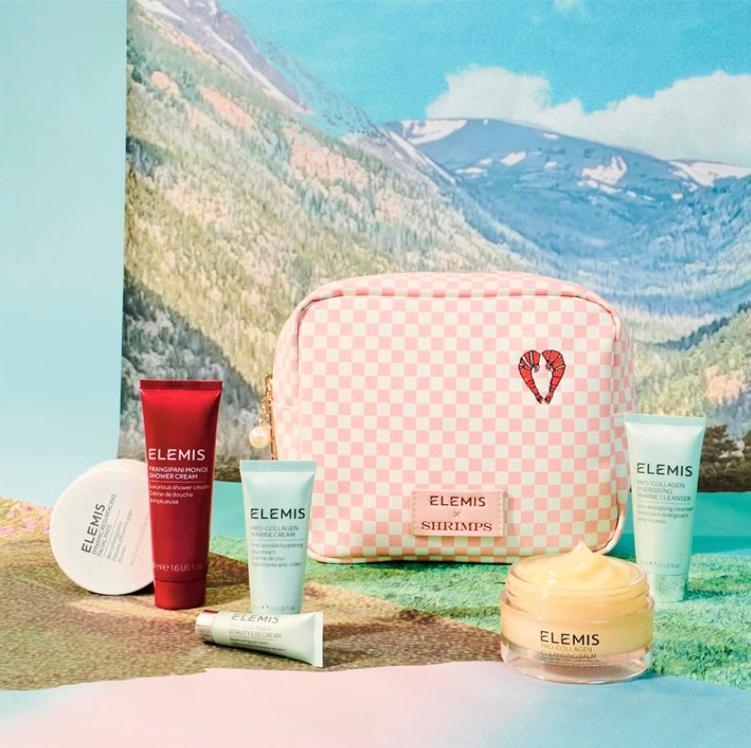 Elemis x Shrimps Travel Icons — набір мініатюр для рутини у відпустці. Де замовити: офіційні партнери Elemis. Як використовувати: дотримуйтесь послідовності з набору: очищення → тон/подушечки → крем → догляд за тілом/очима.